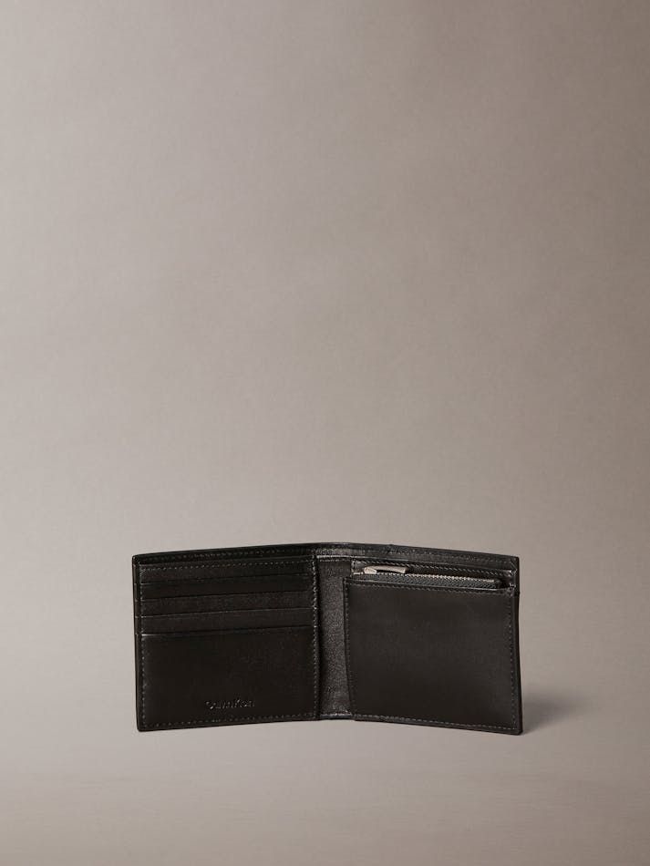 Ví da 100% với họa tiết monogram dập nổi. Ví nam gập đôi này có các khe đựng thẻ và một ngăn đựng tiền xu có khóa kéo bên trong.