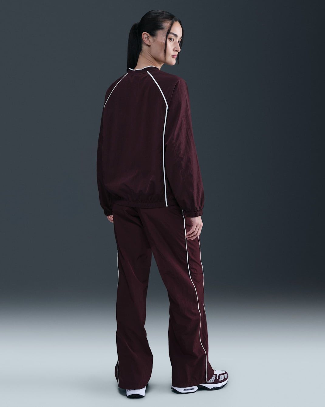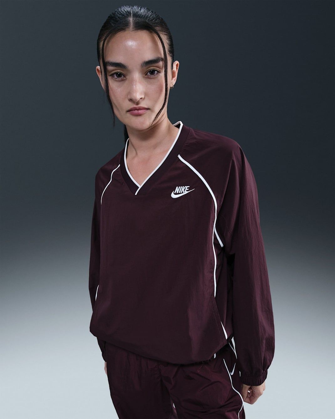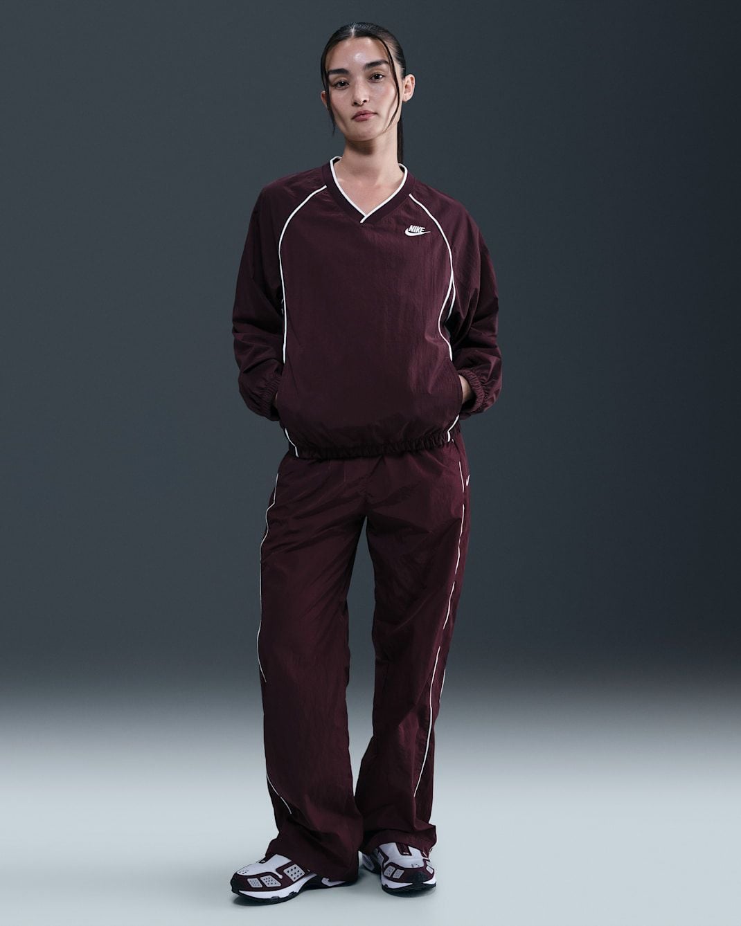 Chiếc áo Nike Sportswear Windrunner Women's Pullover Top không chỉ là một trang phục thể thao; đó là lời khẳng định về phong cách Quiet Luxury hiện đại. Với cảm hứng từ dòng Windrunner huyền thoại, sản phẩm được tái hiện qua gam màu Đỏ đô (Burgundy) sâu lắng, mang đến vẻ ngoài sang trọng và quyền lực. Thiết kế cổ chữ V tinh tế kết hợp cùng đường viền trắng (piping) chạy dọc tay áo tạo nên một silhouette vừa năng động vừa thanh lịch, sẵn sàng đồng hành cùng bạn từ phòng tập đến những buổi cafe cuối tuần.