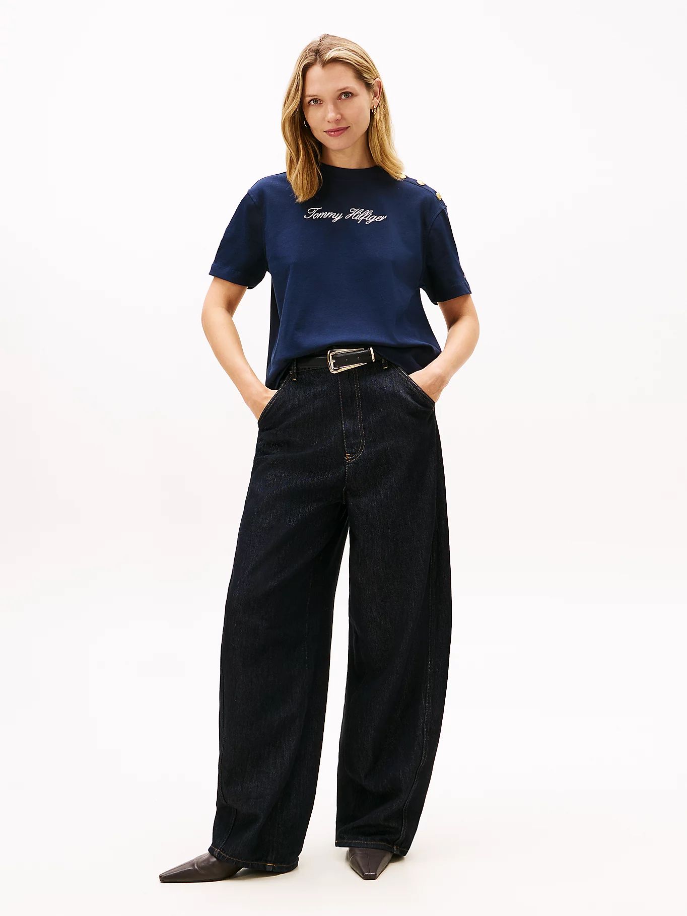 Tommy Hilfiger - Áo thun tay ngắn nữ Gold-Tone Button Logo Embroidery Relaxed T-Shirt